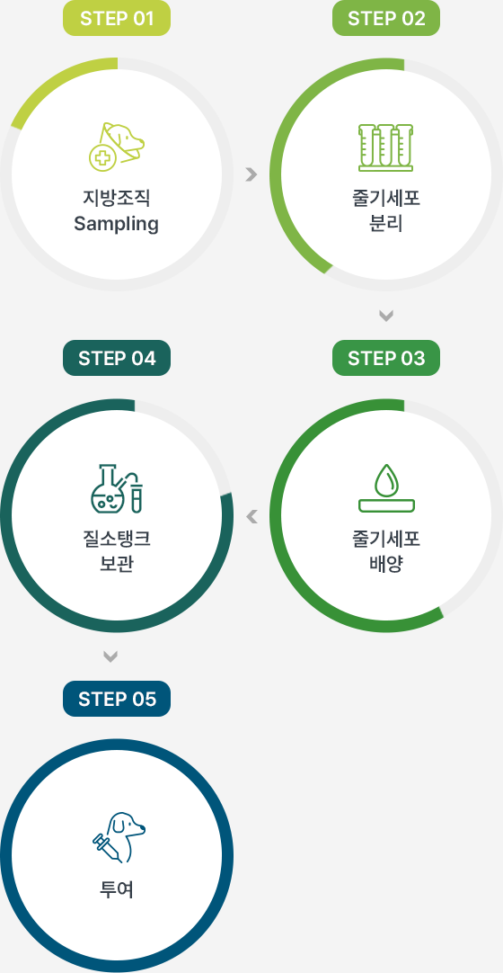 현재 국내 야외 임상 단계에 진입하였으며 국내 최초 반려동물용 줄기세포치료제 상용화를 앞두고 있습니다.