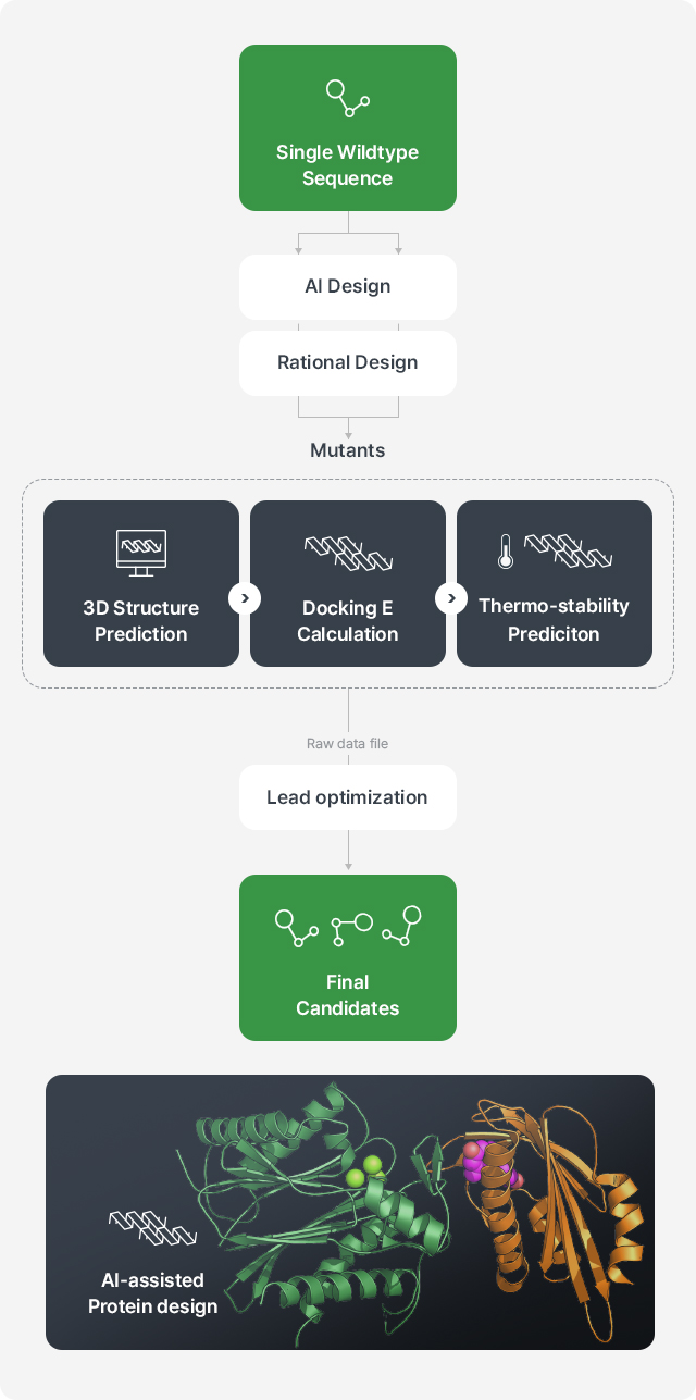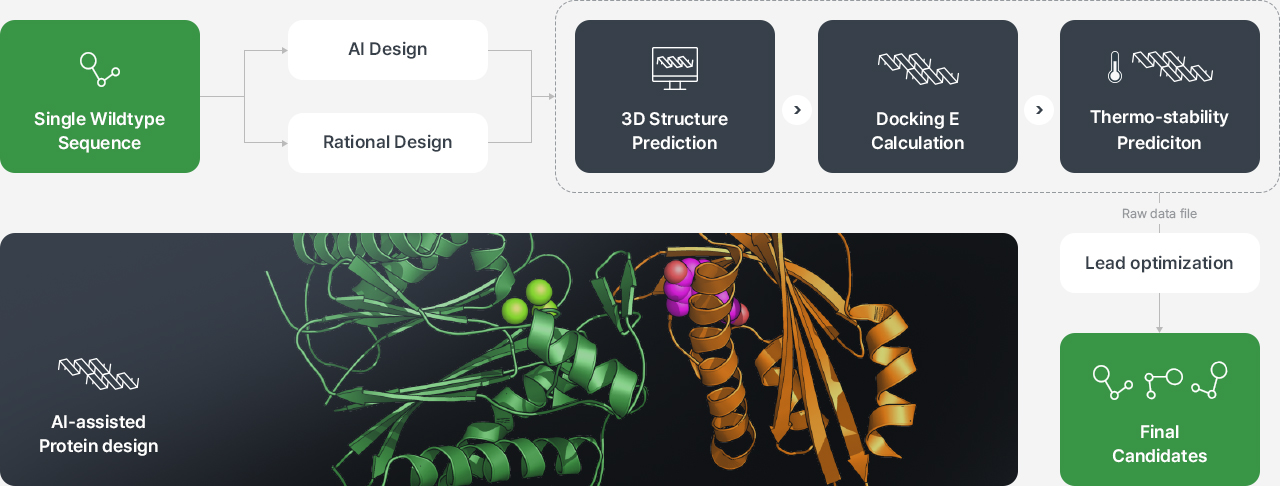 AI 기반 신약 설계 플랫폼단백질 3차원 구조 정보와 예측 알고리즘을 바탕으로 타겟 단백질에 최적화된 후보물질을 설계하는 기술 보유 -