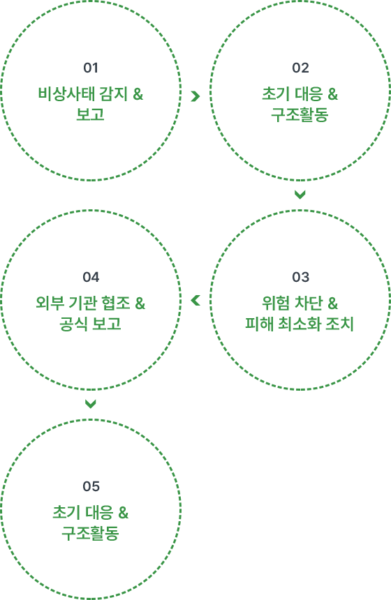 04 사고 예방 및 신속대응작은 위험 신호도 간과하지 않습니다. 사고를 미연에 방지할 수 있도록 철저한 사전 관리 체계를 갖추고 있으며, 만일의 경우에도 신속하고 체계적으로 대응할 수 있도록 매뉴얼을 정비하고 있습니다.