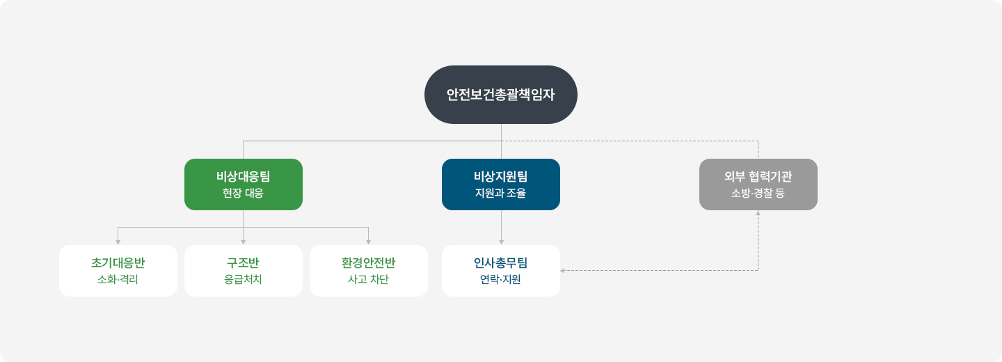 - 외부 기관(소방서, 경찰서, 환경청 등)과의 협조 및 보고 책임 수행
