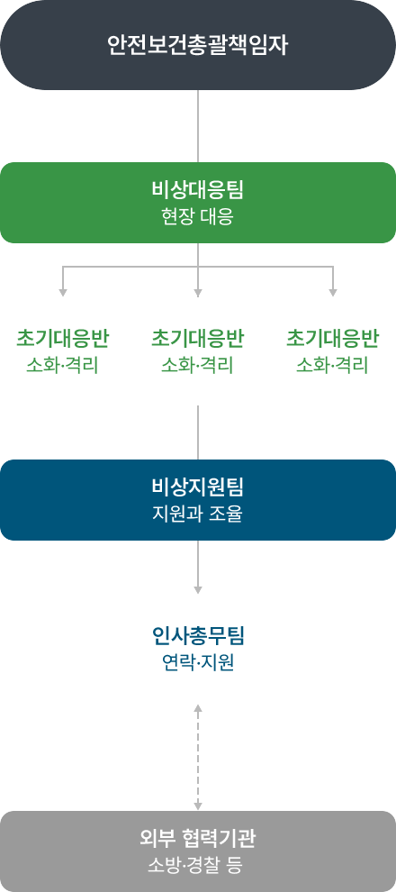 - 초기 대응반: 화재, 화학물질 유출, 재난 발생 시 초동 조치 (소화, 방재, 대피 안내 등)