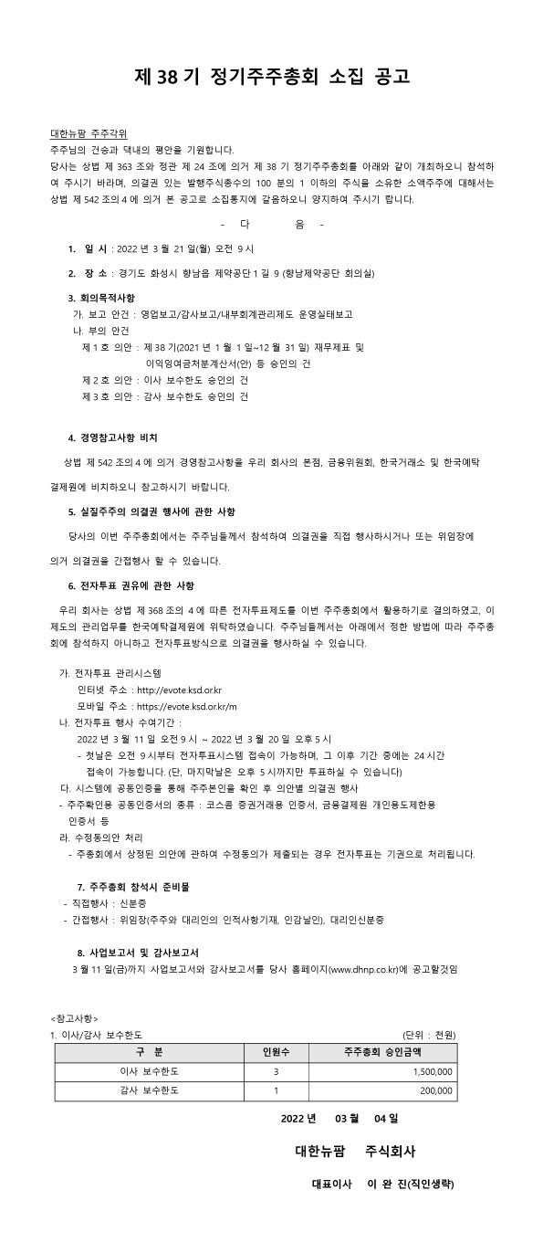 제38기 정기주주총회 소집 공고